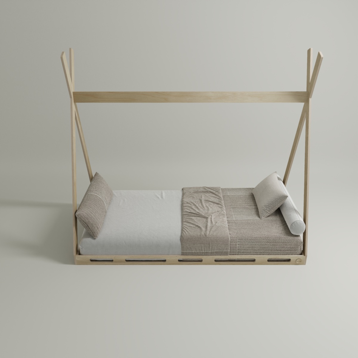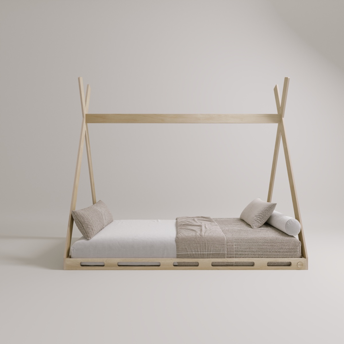 TL;DR: A wooden Montessori floor bed (tent style) with a safe, low-to-the-ground design that encourages independent sleep for children. Available in crib, twin, and full size options.